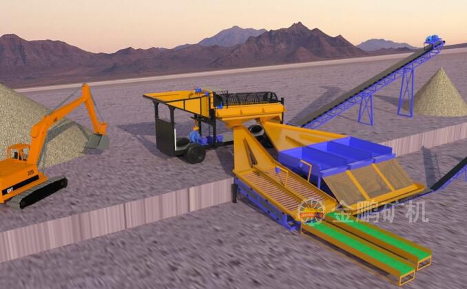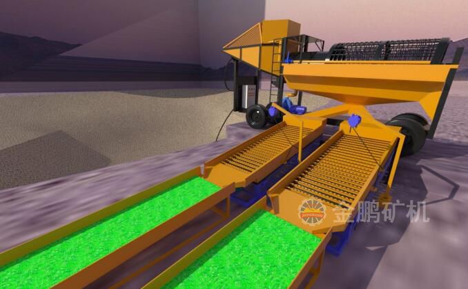 原礦通過礦用自卸車運(yùn)輸?shù)竭x金車礦倉,礦倉上設(shè)有格篩防止大塊礦石進(jìn)入到分級洗礦篩對篩子造成危害,礦石在篩子內(nèi)通過高壓水的沖洗使礦石、泥土、顆粒金分開。篩上產(chǎn)品通過皮帶運(yùn)輸機(jī)直接運(yùn)輸?shù)綇U料堆廠,篩下產(chǎn)品經(jīng)過鼓動(dòng)溜槽先進(jìn)行富集,然后再自流至固定溜槽進(jìn)一步回收有價(jià)金,通過兩次選別作業(yè)顆粒金的回收率可高達(dá)70%以上。我公司生產(chǎn)的移動(dòng)式砂金選礦車解決了原來固定式運(yùn)輸成本高的弊病更適合旱地選金。