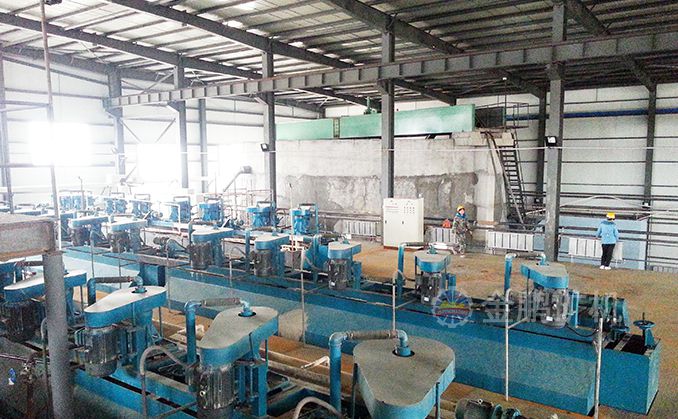 本工藝采用兩段一閉路破碎流程,合格產(chǎn)品進(jìn)入粉礦倉緩存,礦石由擺式給礦機(jī)均勻的給到直筒節(jié)能格子型球磨機(jī)進(jìn)行磨礦,格子球磨機(jī)和高堰式單螺旋分級組成一段閉路磨礦分級流程。球磨機(jī)的排礦先經(jīng)過跳汰機(jī)富集大顆粒金,跳汰機(jī)底流通過兩段搖床選出30%品位的顆粒金,跳汰機(jī)的溢流進(jìn)入分級機(jī)。分級溢流經(jīng)過攪拌槽的調(diào)漿后進(jìn)入浮選系統(tǒng),通過做礦石的可選性實(shí)驗(yàn)研究我們選擇一粗三精三掃的浮選流程,從而很大程度的回收脈石中的有價(jià)金元素。浮選金精礦通過濃密機(jī)濃縮由過濾機(jī)完成脫水作業(yè),浮選尾礦由濃密機(jī)濃縮后進(jìn)入壓濾機(jī)進(jìn)行壓濾成濾餅做到尾礦干排。金礦重浮聯(lián)合流程也是金鵬集團(tuán)用于山東黃金集團(tuán)蓬萊大柳行選廠項(xiàng)目中的成功經(jīng)驗(yàn)。