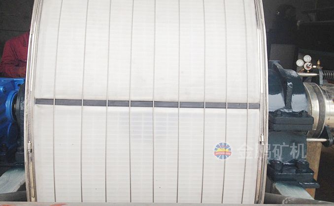 整個(gè)筒體外面裹著濾布,為了保證每室之間的密封,濾布用膠條、麻繩或棕繩嵌在隔條的繩槽內(nèi)。然后再用繞線機(jī)構(gòu)在筒體外面沿軸向以50-80mm的間距纏繞很多道鋼絲,把濾布固定在筒體上。