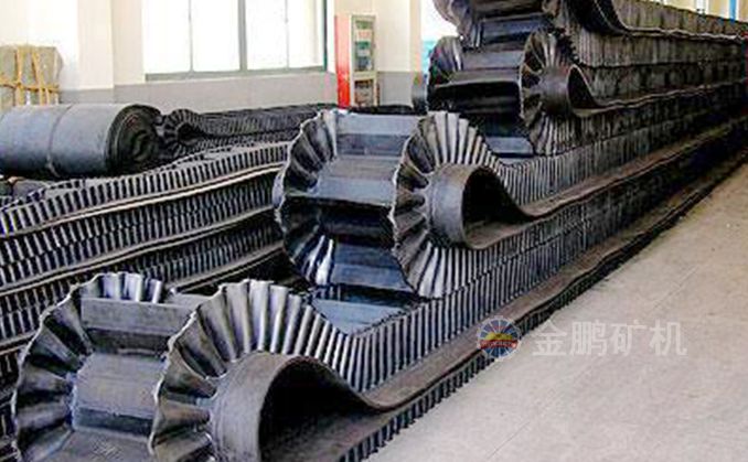 波狀擋邊輸送帶中以大傾角波狀擋邊輸送帶最有名,大傾角波狀擋邊輸送帶又叫裙邊隔板輸送帶,是由基帶、擋邊、橫隔板3部分組成。擋邊起防止物料測滑撒落的作用。為便于繞過滾筒,檔邊設計成波紋狀;橫隔板的作用是承托物料,為了實現大傾角輸送,采用T型TC型。檔邊和橫隔板是用二次硫化的方法與基帶連接的,具有很高的連接強度。