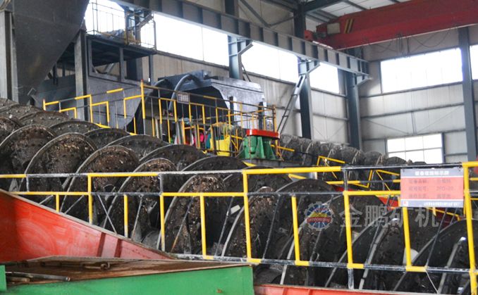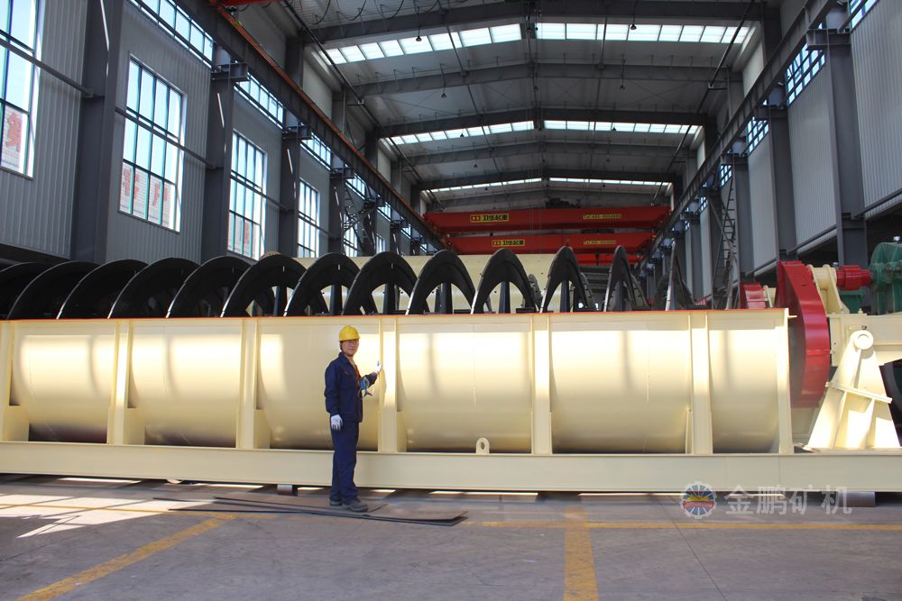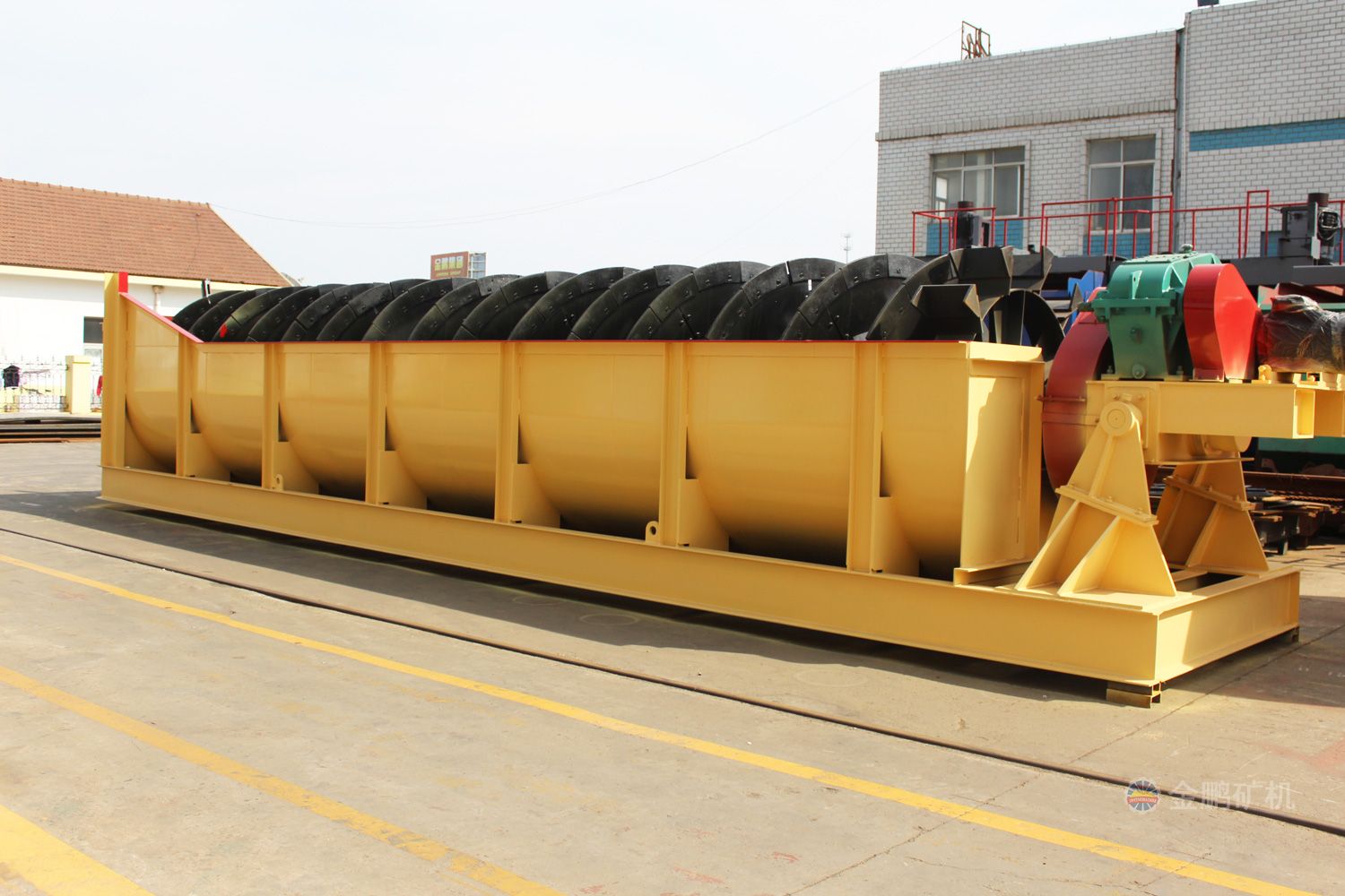 高堰式螺旋分級機采用將磨細后的礦漿從位于沉降區中部的進料口給入水槽,傾斜安裝的水槽下面是礦漿分級沉降區,螺旋低速轉動,對礦漿起攪拌作用,使細顆粒懸浮到上面,流到溢流堰處溢出。粗顆粒沉到槽底,由螺旋輸送到排料口作為返砂排出。溢流堰的位置高于螺旋軸下端的軸承中心,低于溢流端螺旋上緣。